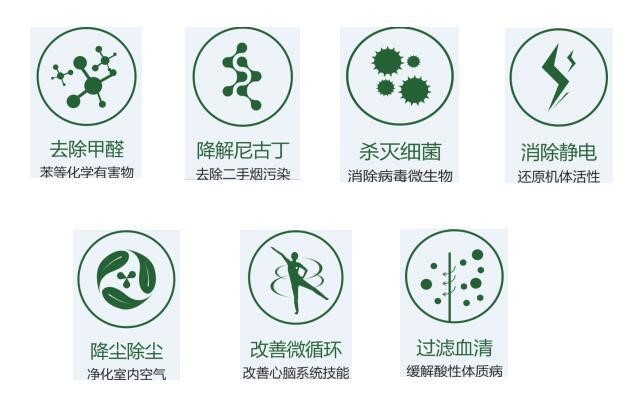 城市環(huán)境污染嚴(yán)重,負(fù)氧離子含量微乎其微,影響著人體健康,引發(fā)一系列健康問題與疾病。在空氣凈化領(lǐng)域,負(fù)離子的作用主要表現(xiàn)在負(fù)離子中的小離子可以捕捉漂浮微塵,使其凝聚而沉淀,從而使空氣凈化,當(dāng)濃度達(dá)到20000個/cm3時,空氣中的飄塵會減少98%以上,飄塵直徑越小,越易被沉淀,所以在含有高濃度負(fù)氧離子的空氣中,直徑1μm以下的微塵、細(xì)菌、病毒等幾乎為零。負(fù)氧離子可迅速分解、祛除室內(nèi)空氣中的甲醛、甲苯、VOC、二手煙塵等多項(xiàng)有害物質(zhì),有效沉降PM2.5。
