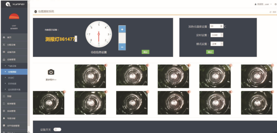 遠程蟲情分析測報儀利用現代光、電、數控技術,實現了在無人監管的情況下,能自動完成誘蟲、殺蟲、收集、分裝、排水等系統作業,通過GPRS移動無線網絡,定時拍照采集接蟲盒內收集的蟲體圖片,自動上傳到遠程物聯網監控平臺,平臺每天自動記錄采集數據,形成蟲害數據庫,可以通過數據列表和圖表的形式展現,工作人員可隨時遠程了解以蟲體的情況和變化,制定防控措施。
