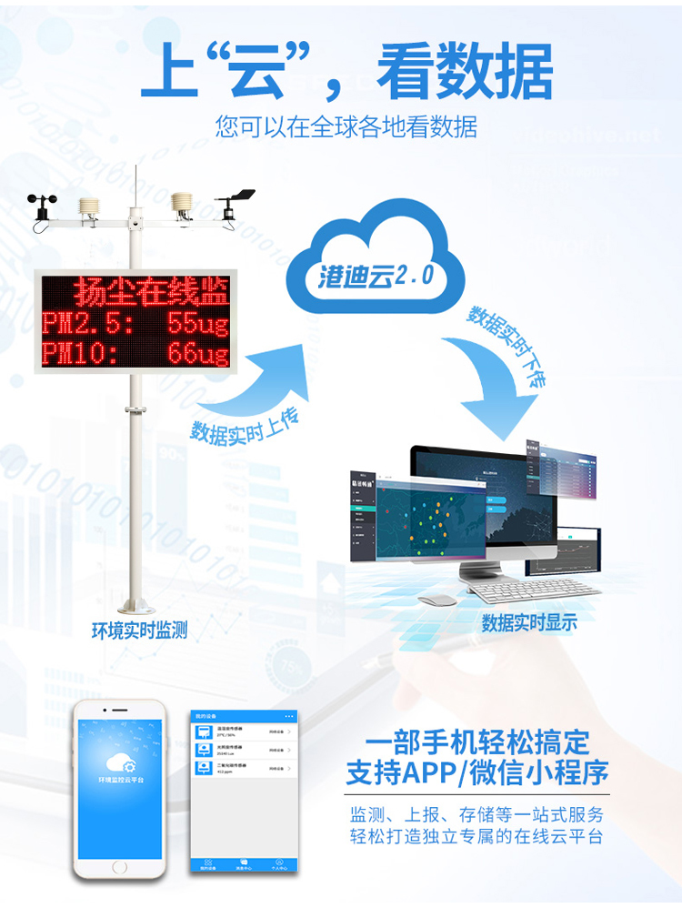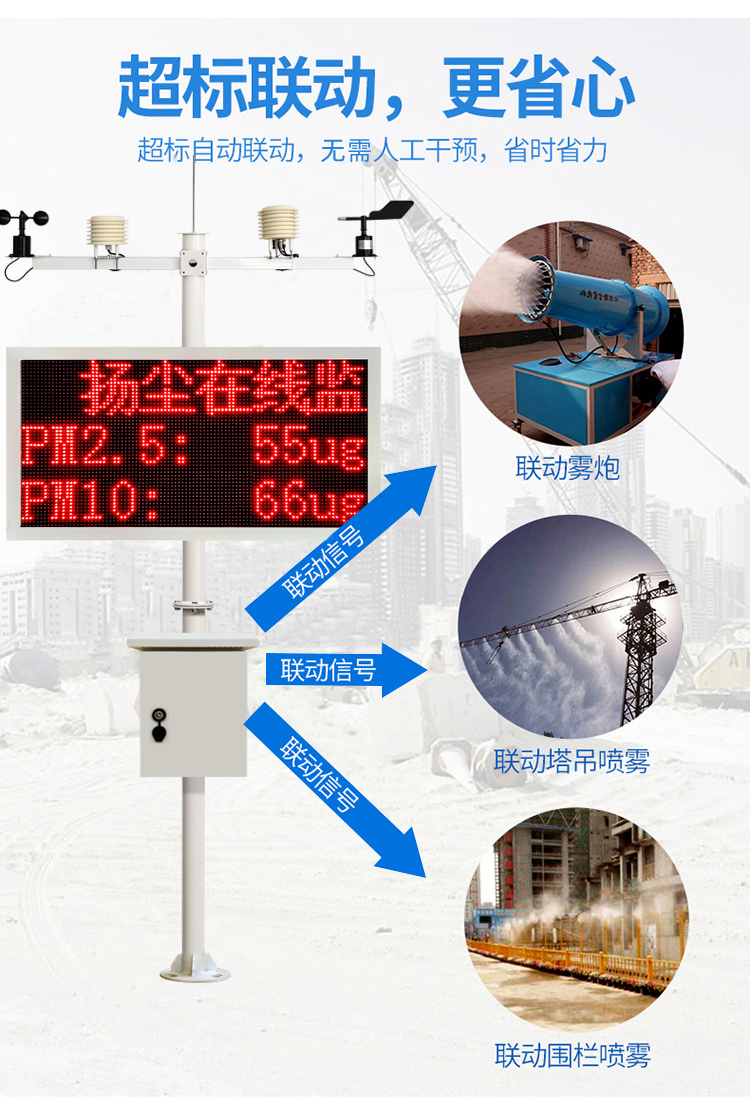 本系統由實時在線監測系統、視頻系統、數據顯示分析系統、預警控制系統、噴淋系統、無線傳輸系統、后臺數據處理系統及信息監控管理平臺組成。在線監測系統集成了TSP、PM2.5、PM10監測、環境溫濕度及風速風向、噪聲監測及有毒有害氣體監測等多種功能;數據平臺是一個互聯網架構的網絡化平臺,具有對監測站的監控功能以及對數據的報警處理、記錄、查詢、統計、報表輸出等多種功能。該系統還可與各種污染治理裝置霧炮、塔吊噴水系統、圍墻噴淋等聯動,以達到自動降塵控制的目的。